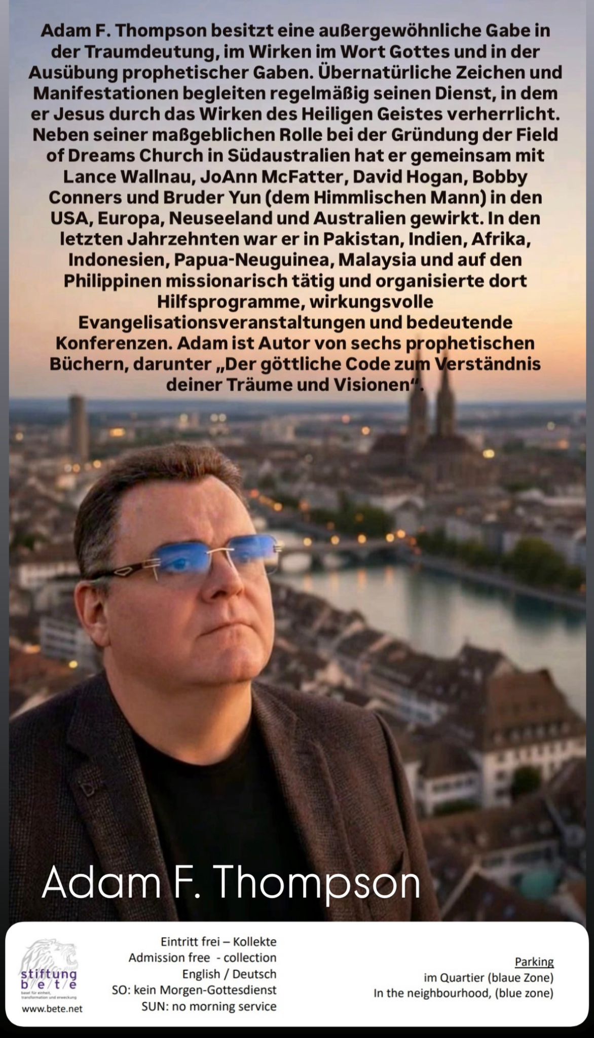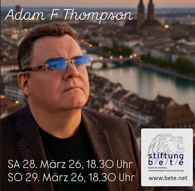 Special Meetings mit Adam F. Thompson, ursprünglich aus Australien. Er hat einen starken prophetischen Dienst, besonders auch die Gabe der Auslegung von Träumen. Er wird am SA u. SO, 28. & 29. März 26 je um 18.30h in der Margarethenstr. 103, 4053 Basel (hop Gebäude) predigen.