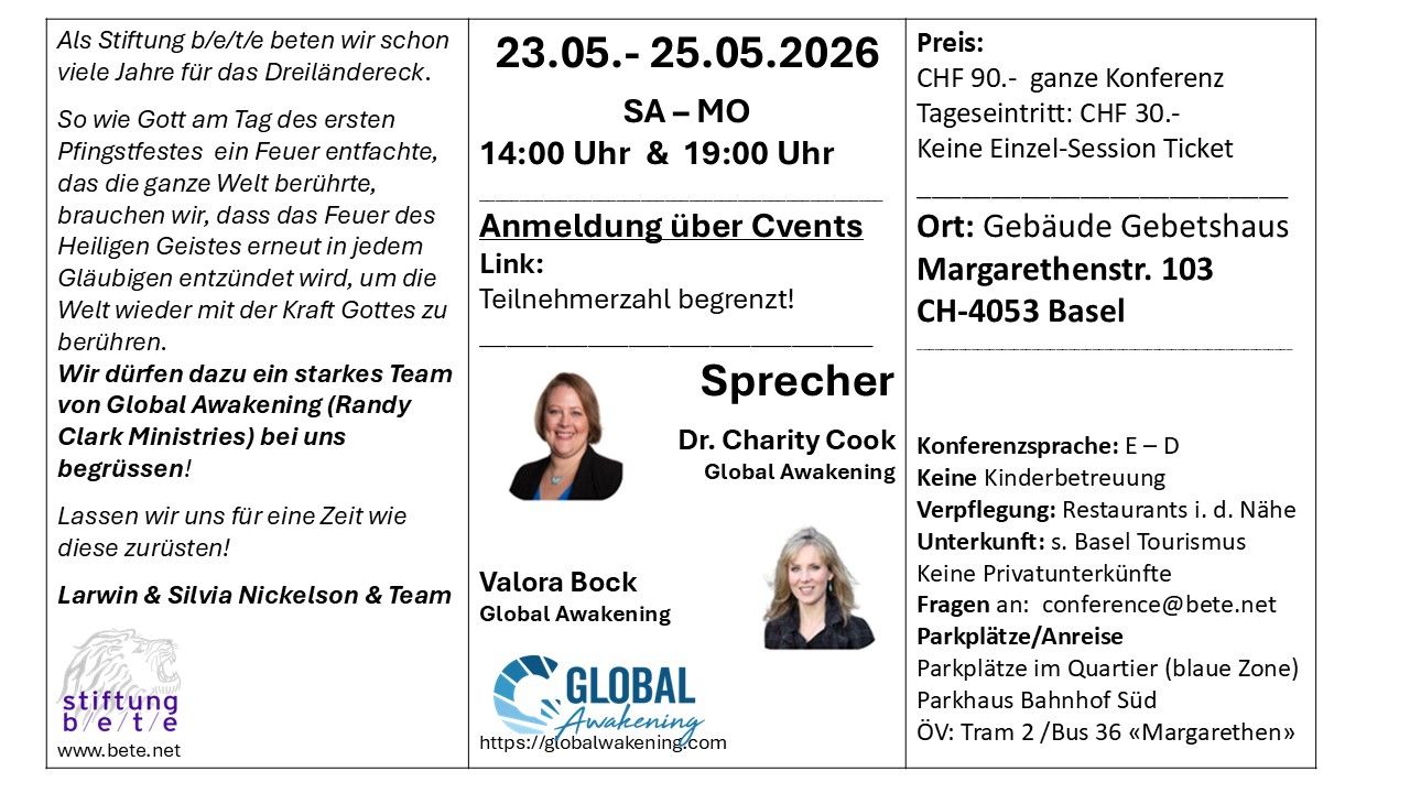 Im Mai (23.-25. Mai 26) veranstalten wir die Pfingstkonferenz IGNITE! mit Dr. Charity Cook und Valora Bock & Team von Global Awakening, USA (Randy Clark Ministries).
